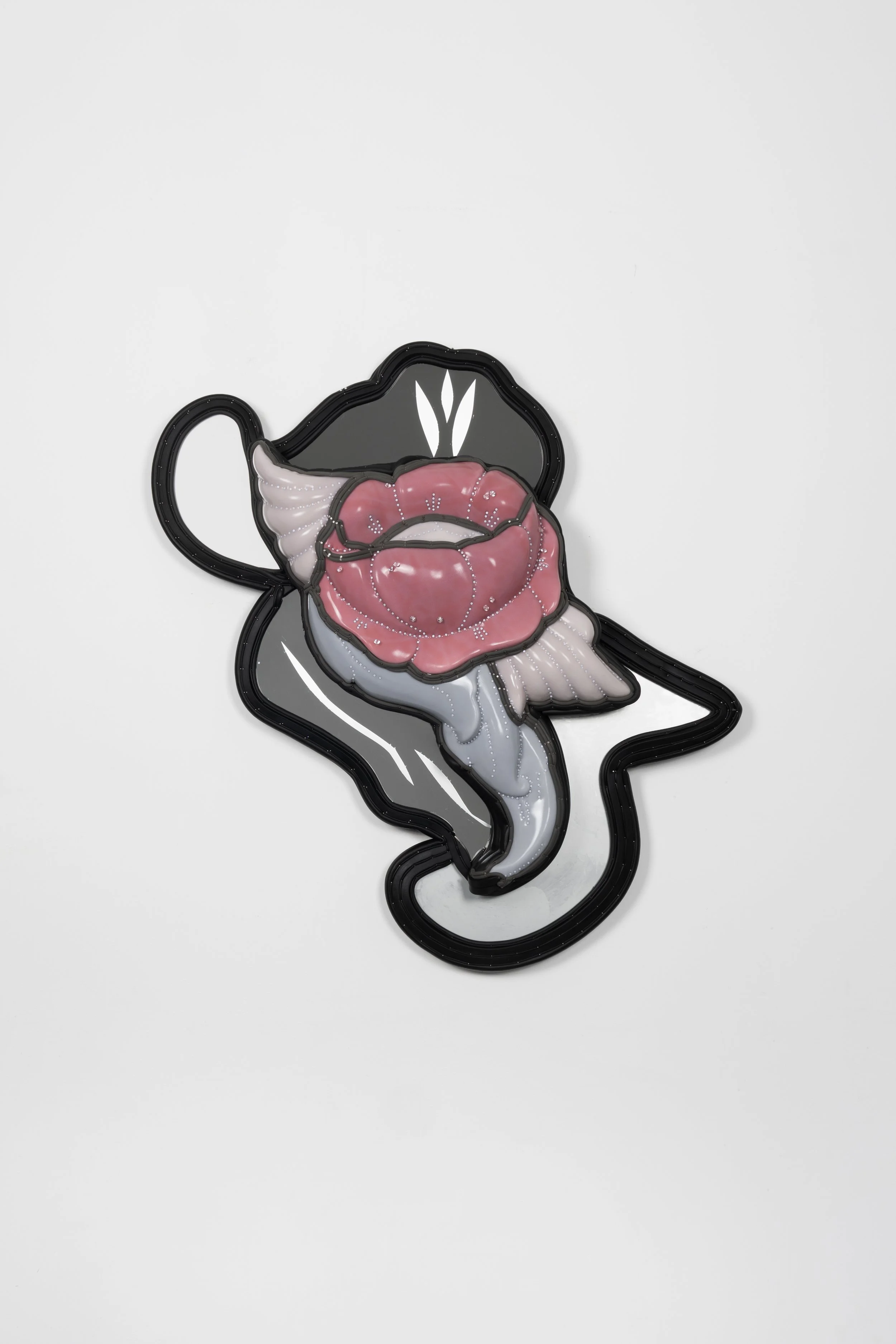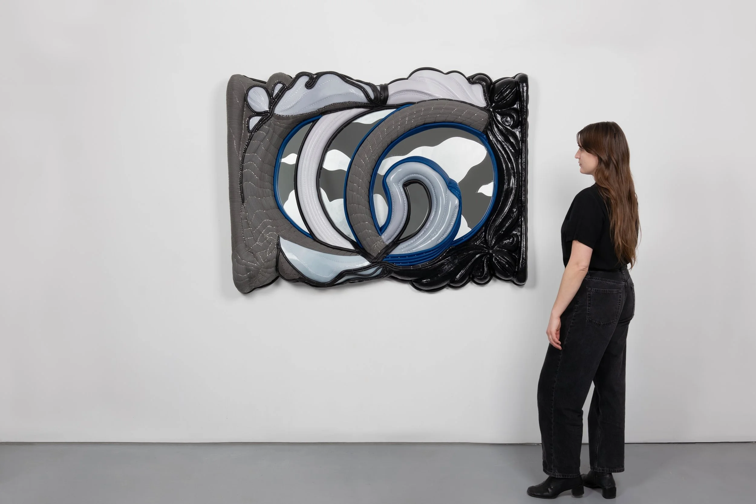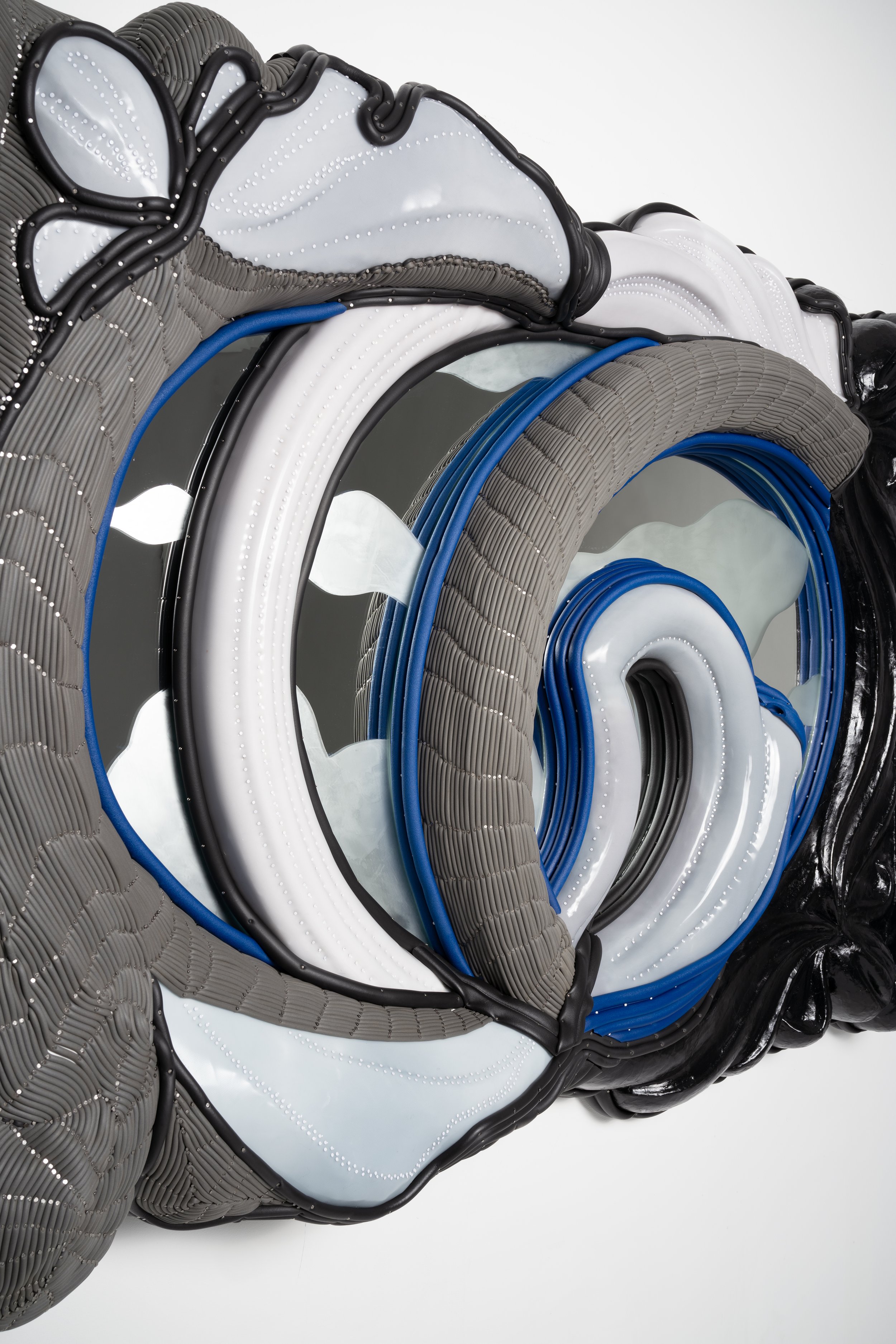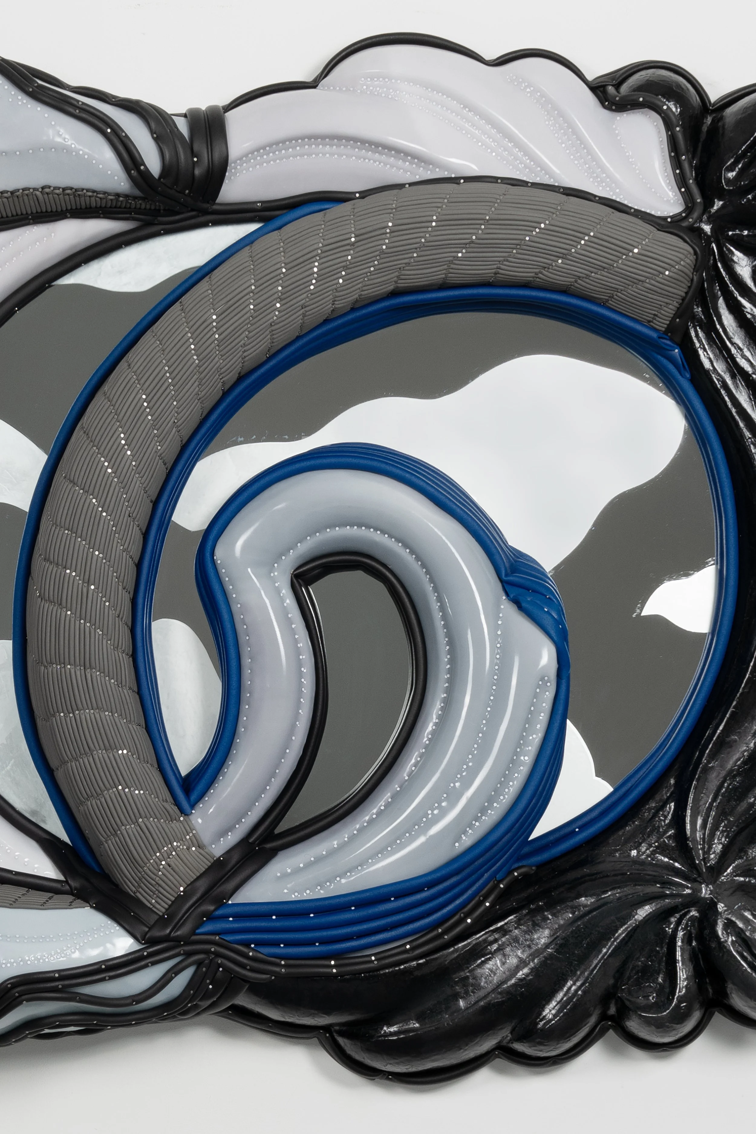 Found vanity mirror, silicone, neoprene, mirror, cast polyurethane foam, lacquered paper mache, steel tacks and nails