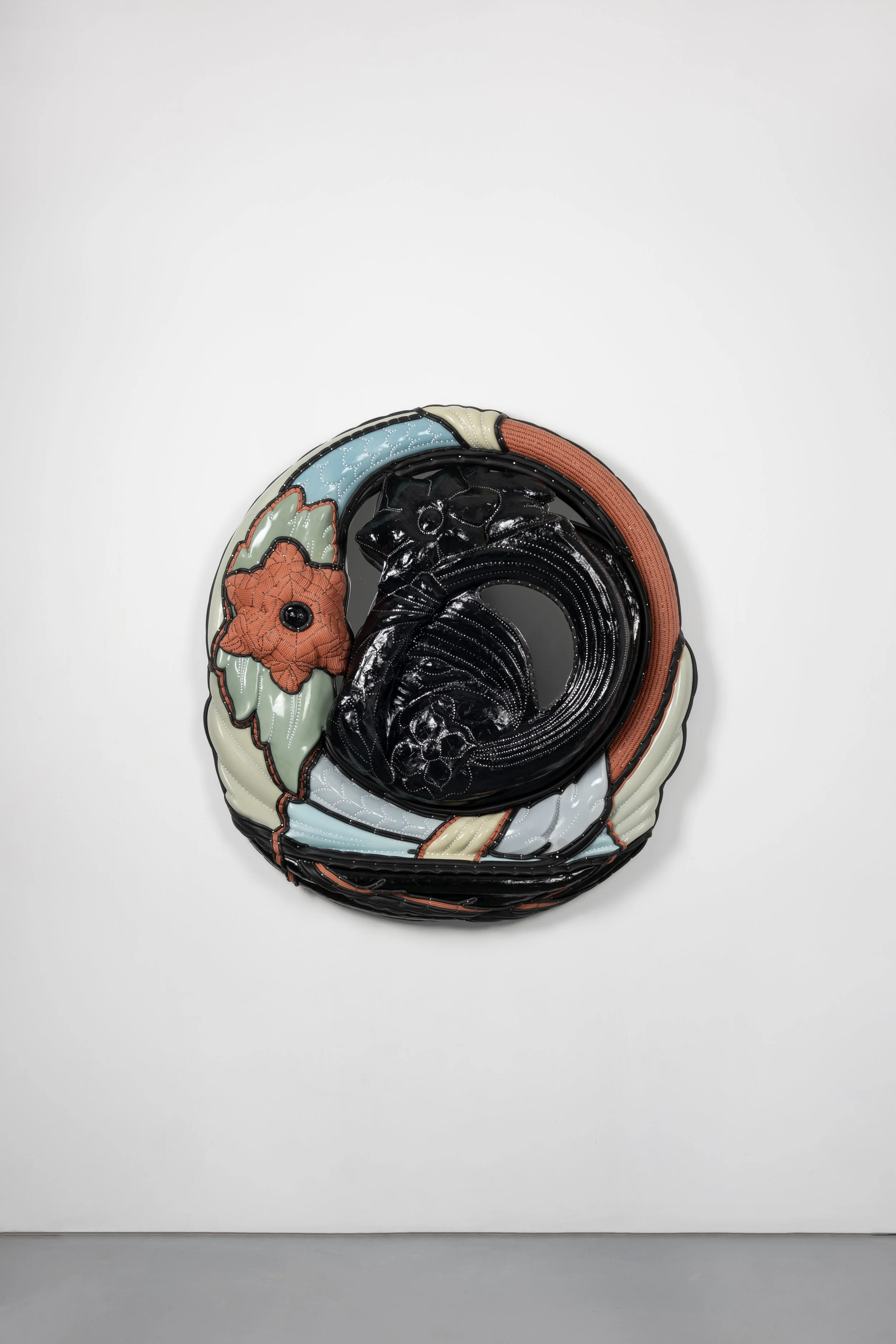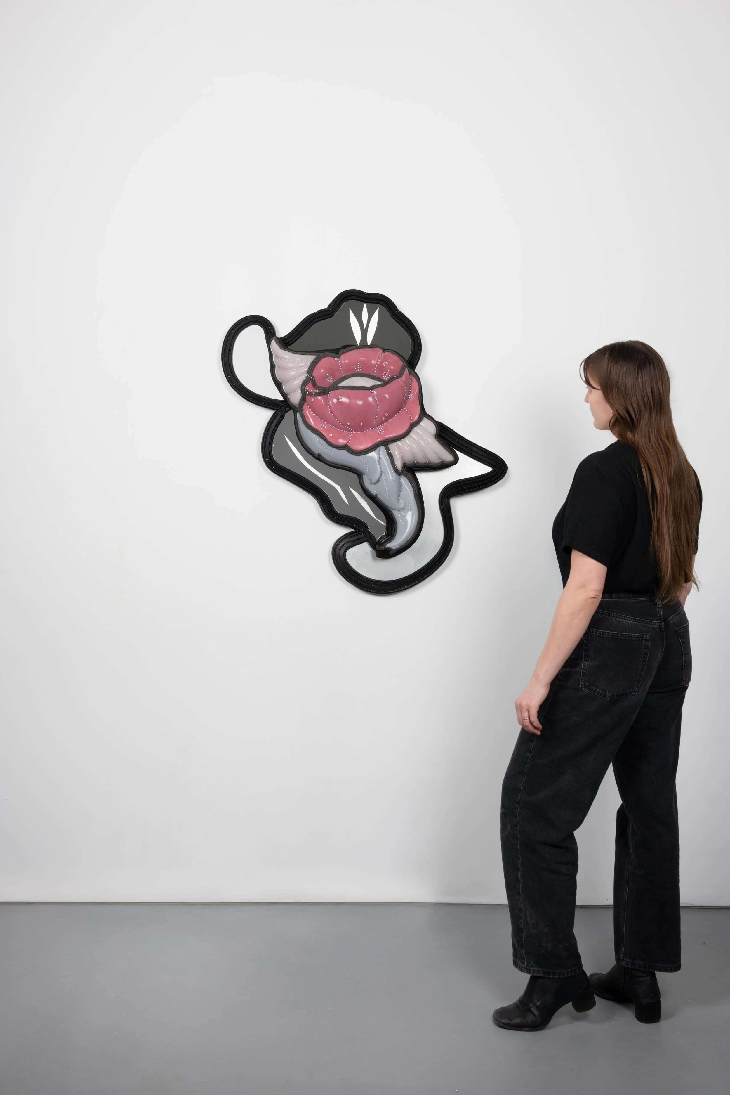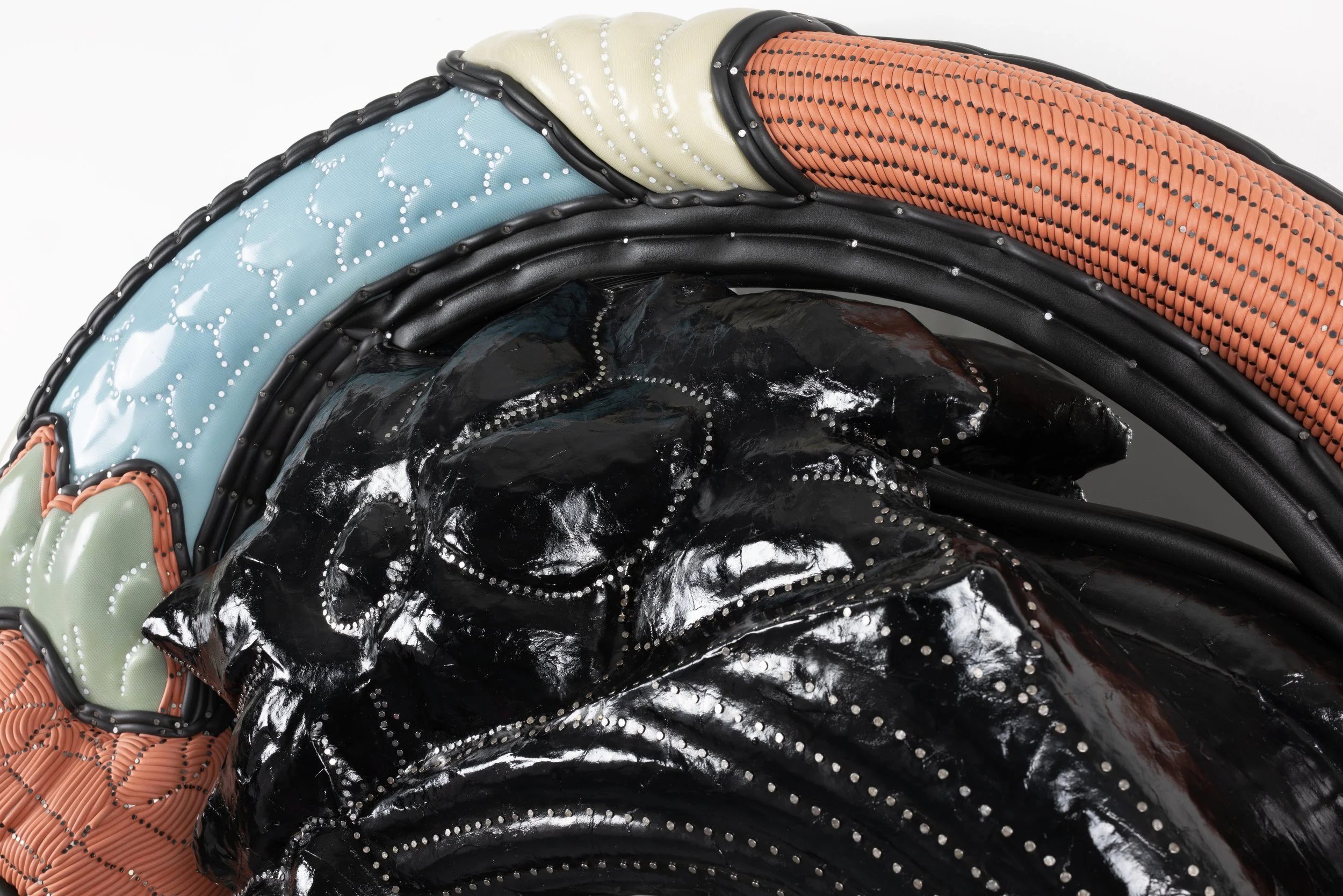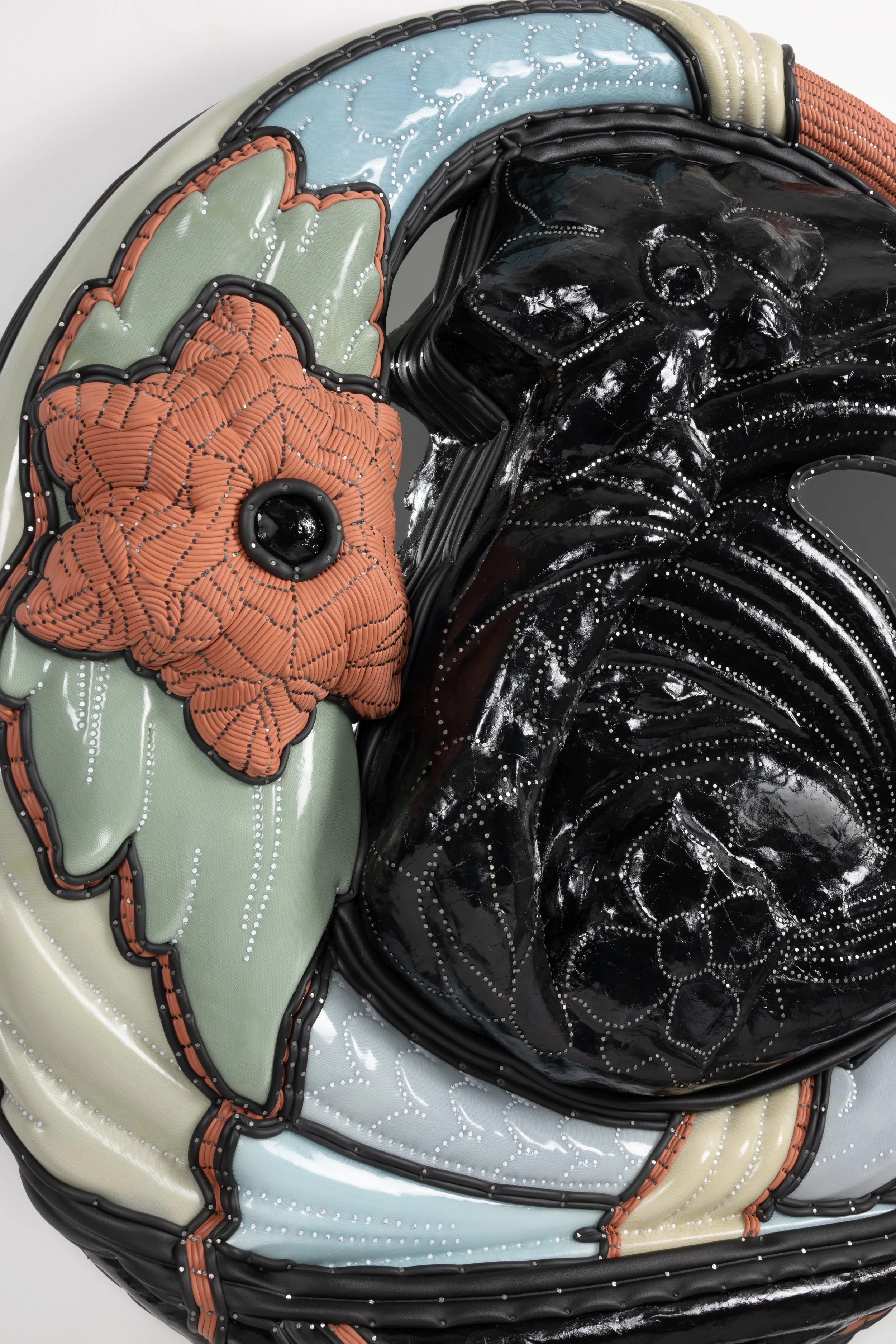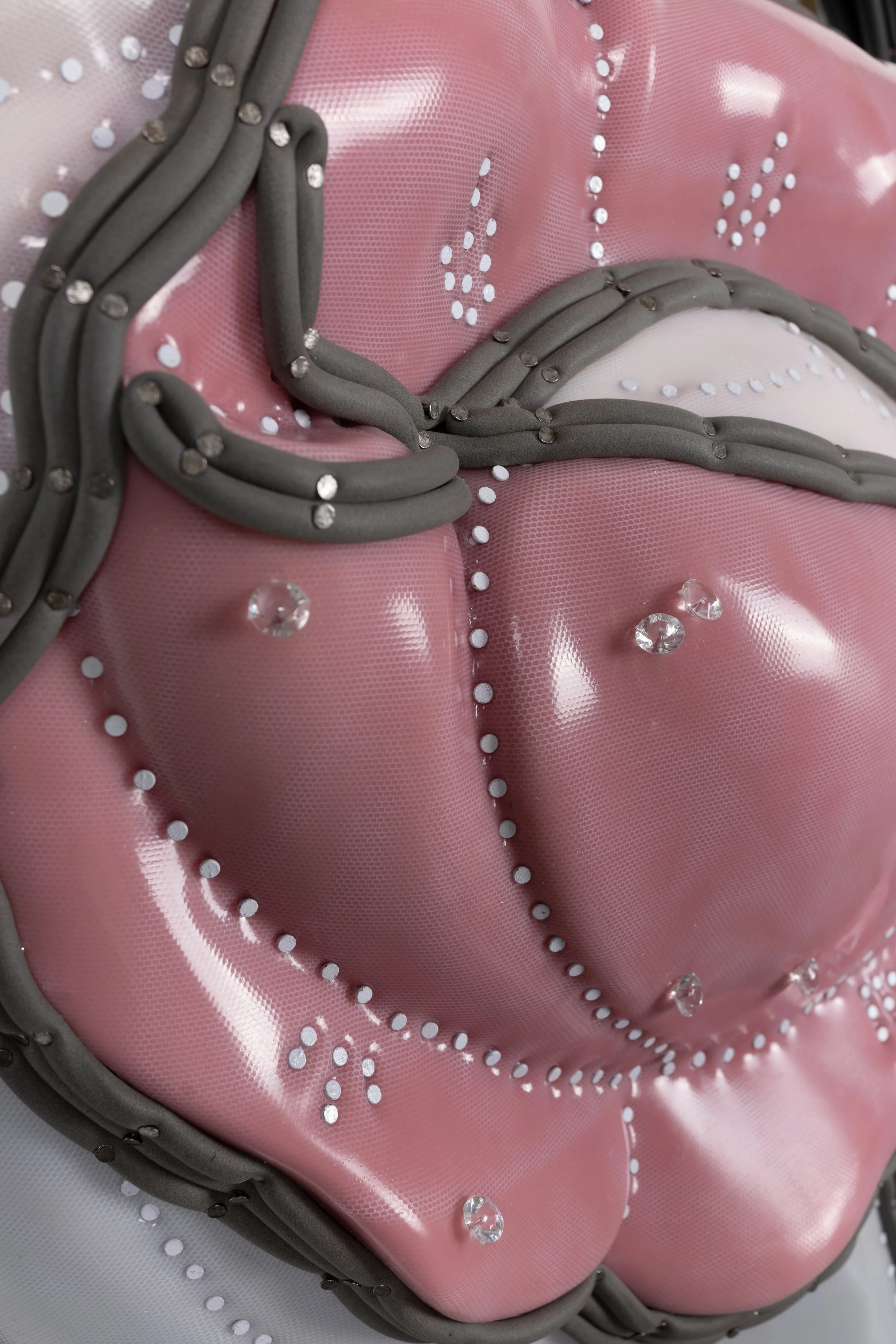 Found vanity mirror, silicone, neoprene, mirror, cast polyurethane foam, lacquered paper mache, steel tacks and nails